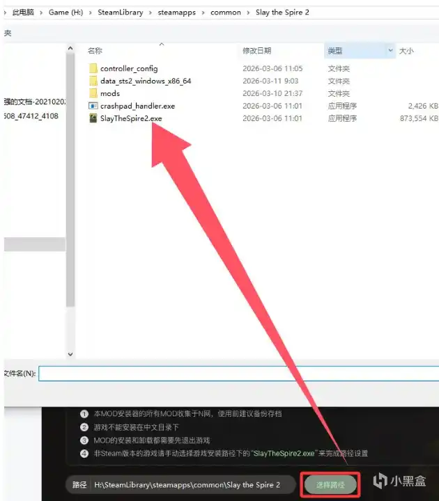2. 回到MOD安装器,点击「选择路径」,找到游戏安装目录里的SlayTheSpire2.exe,选中它,路径设置就完成啦!